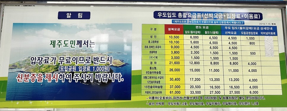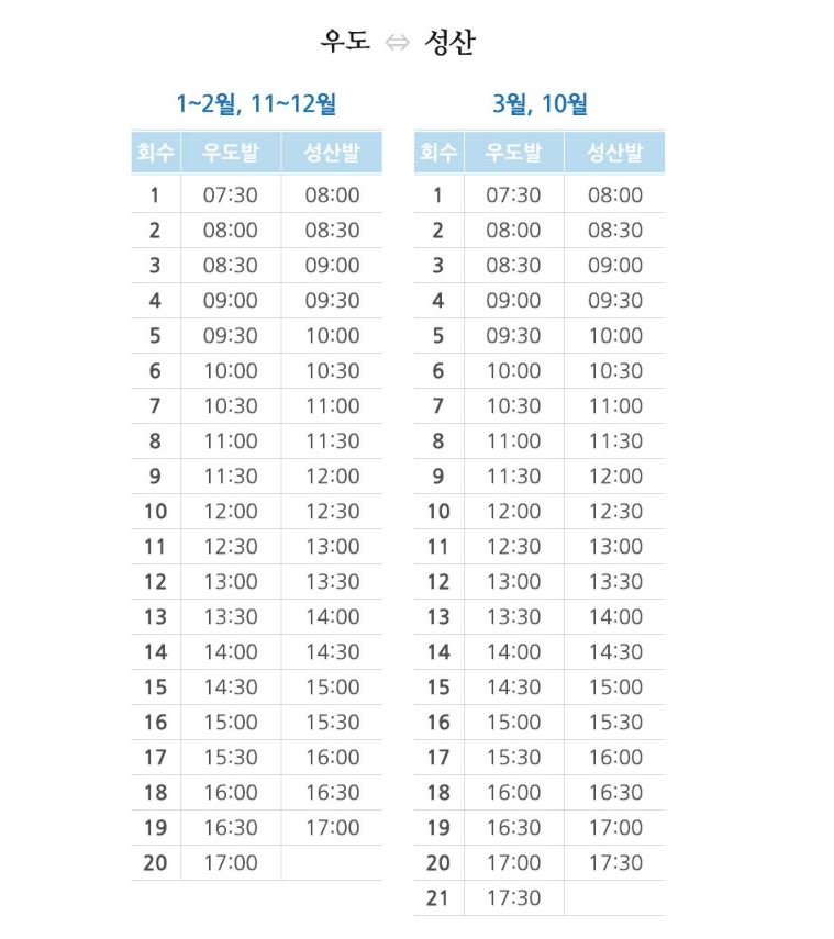2024년 우도 1회차 출항 시간이 변경되었습니다. 변경된 최신 배시간표를 첨부하오니 꼭 확인하시고 탑승하시길 바랍니다. 월별 우도 배시간이 다르오니 이점 착오 없으시길 바랍니다.