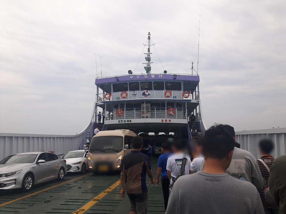 저희는 안내에 따라 배에 탑승을 하였습니다. 우도 선착장 직원분들이 전부 안내를 해주고 표 검사 후 바로 탑승을 할 수 있었습니다. 일단 성산 일출봉에서 탑승을 할 때에는 차들이 먼저 탑승 합니다. 그리고 승객이 탑승을 하는 구조로 되어있고 반대로 우도에서 돌아올 때는 사람분들이 먼저 탑승을 하고 차가 탑승을 하도록 되어있습니다. 그리고 티켓은 무조건 왕복으로 구매를 하셔야 돌아올 때 편리합니다. 그 점 참고하시고 우도까지 차를 가지고 가시는 분들도 있는데 차를 가지고 가는 것보다 우도에는 타고 다닐 수 있는 교통수단 대여가 가능합니다. 그걸 타는 게 더 재미있고 추억을 남겨보는 것도 좋을듯 합니다.