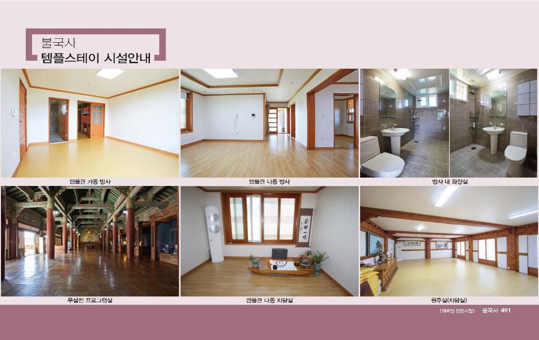 불국사는 하루 최대 110명 내외를 수용할 수 있습니다. 2인실과 3인실 그리고 대방으로 구성되어 있습니다. 화장실, 세면당, 난방시설들이 설치되어 있어 한여름, 한겨울에도 이용이 가능합니다.