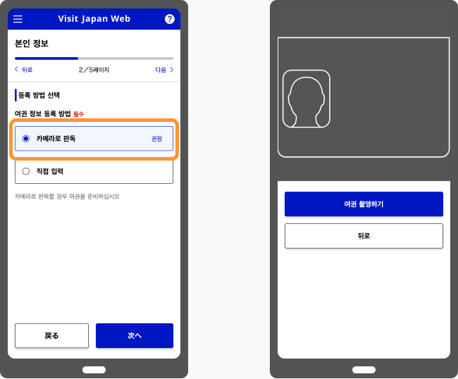 여권 정보의 등록 방법은 「카메라로 스캔」 또는 「직접 입력」 중 하나를 선택하셔야 합니다.