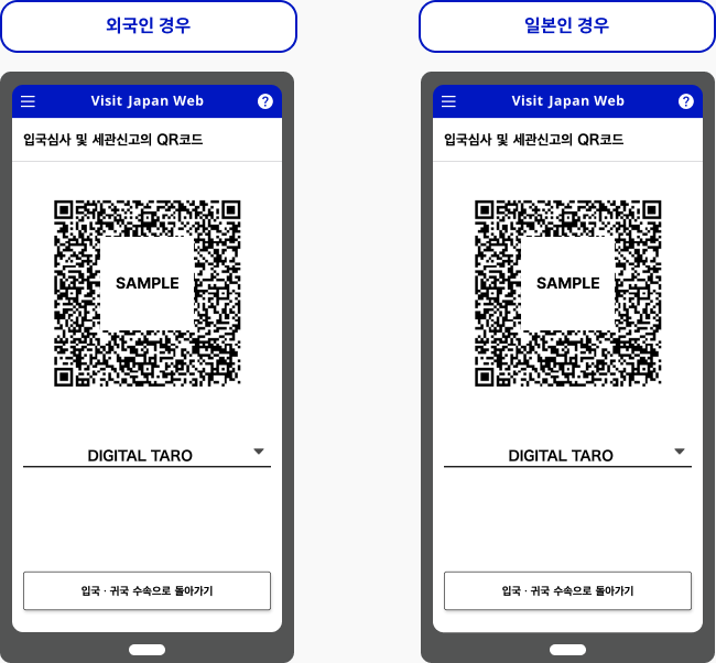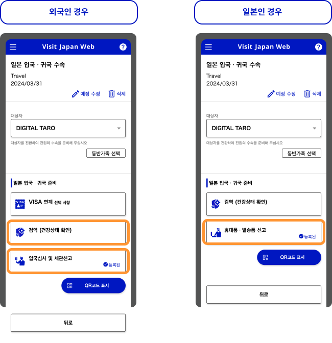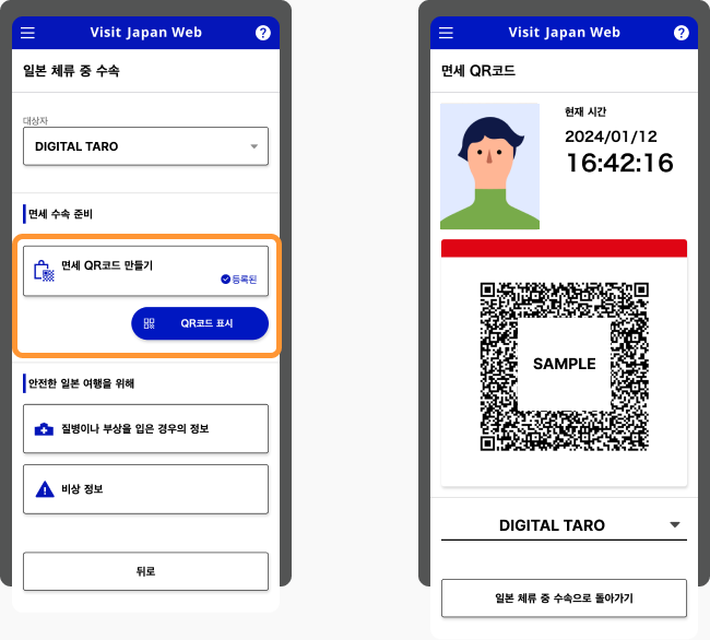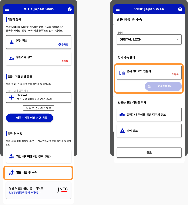 입국 수속(입국 심사 및 세관 신고)에서 사용하는 웹 서비스로 해외에서 입국하는 분 이외에 일본으로 귀국하는 분도 사용할 수 있습니다. 입국 수속에 필요한 정보를 사전에 등록,비지트재팬웹 상에서 2차원 코드를 작성한 후, 입국심사와 세관신고를 할 때 제시하면 빠르게 처리됩니다.
