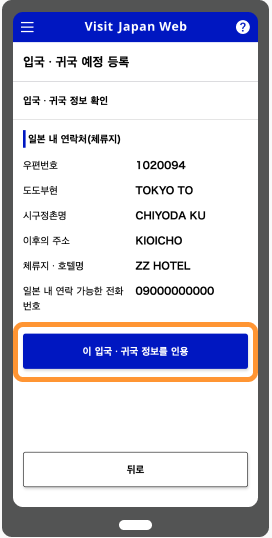 등록을 마친 입국·귀국 정보를 선택한 경우는 「일본에서의 연락처(체재지)」만 인용할 수 있습니다.