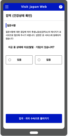 수속 화면의「검역(건강상태 확인)」에서 질문에 답변하고 건강상태에 따른 안내를 확인합니다.