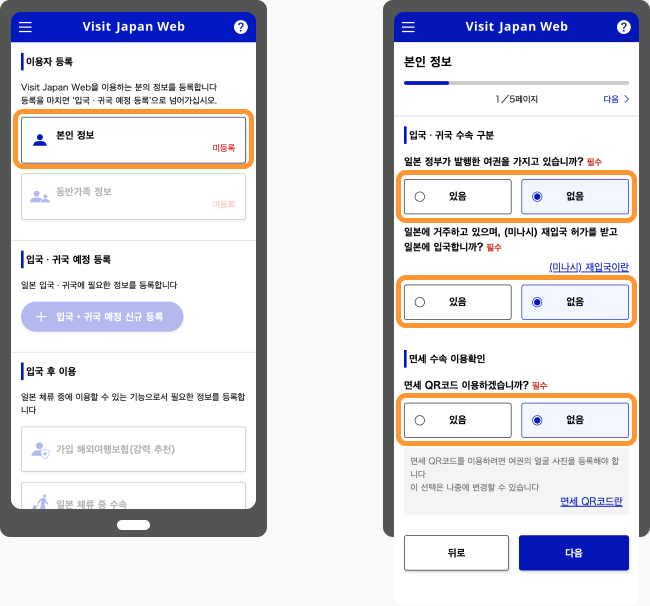 수속화면의「입국심사 및 세관신고」에서정보를 등록합니다.