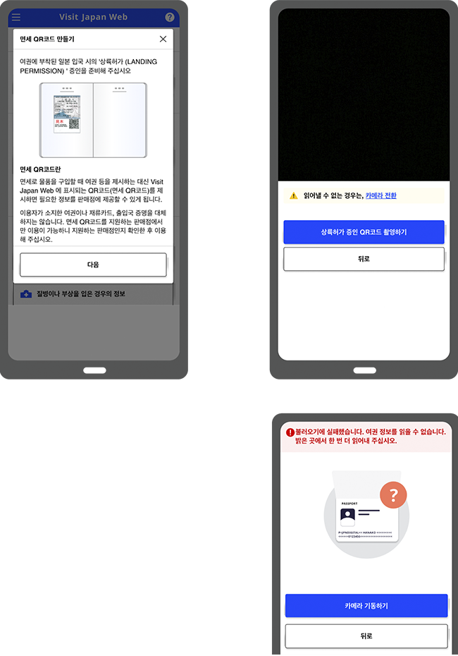 상륙허가증 도장을 가이드 틀에 맞추면 2차원 코드가 자동으로 스캔됩니다.