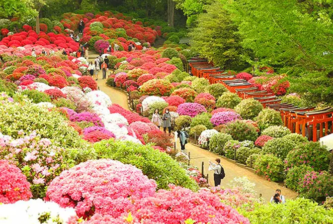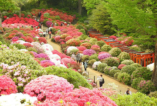 역사서에 따르면 네즈 신사는 1900년 이상 전에 야마토타케루라는 왕자가 창건했다고 합니다. 300년의 역사를 지닌 네즈 신사는 부지 면적 6,600 평방미터에 100종 약 3,000그루의 철쭉이 심어져 있습니다. 그중에는 후지철쭉(콩알만한 작은 꽃이 핍니다), 하나구루마(풍차 모양의 꽃이 핍니다), 가라후네(흑철쭉) 등과 같은 희귀 품종도 있습니다. 꽃 이외에도 식목시장이나 36 가선화 특별전 등도 즐길 수 있습니다. 특별배관 시간은 12시와 14시의 각 20분간입니다. 본전을 비롯한 신사 건물 7동이 국정중요문화재로 지정되어 있습니다.