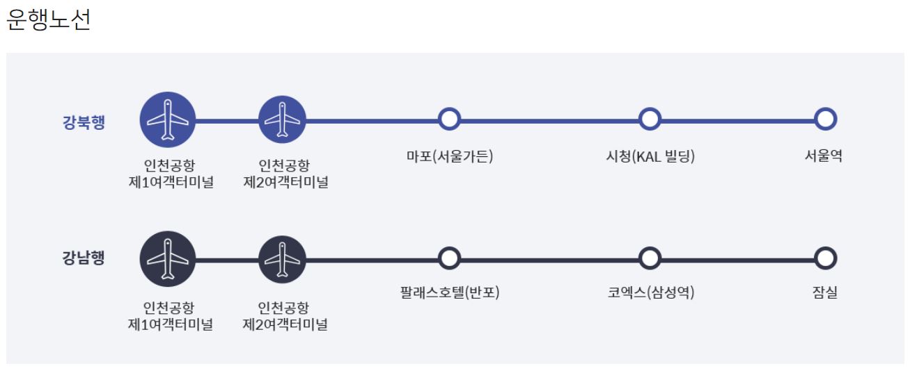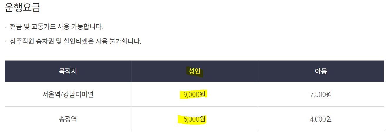 서울역/강남터미널은 9,000원으로 요금이 같습니다. 다만, 송정역을 인천공항에서 비교적 가깝기 때문에 거리에 비례하여 가격은 5,000원으로 상대적으로 저렴한 것을 볼 수 있습니다.
