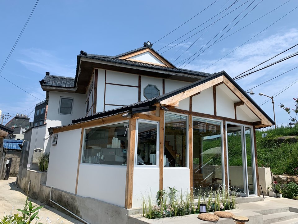 카페 외관부터 신경 많이 썼다는 생각이 들었습니다. 한옥을 리모델링하여 만든 카페여서 그런지 입구부터 굉장히 익숙하지만 나름의 멋을 간직하고 있었습니다. 그리고 골목이 끝나는 곳에 위치하고 있어서 굉장히 자연과 하나 되는 느낌입니다. 초록초록한 풀들과의 조화 그리고 마당에 있는 비치 파라솔마저 이 한옥과 굉장히 조화롭습니다.