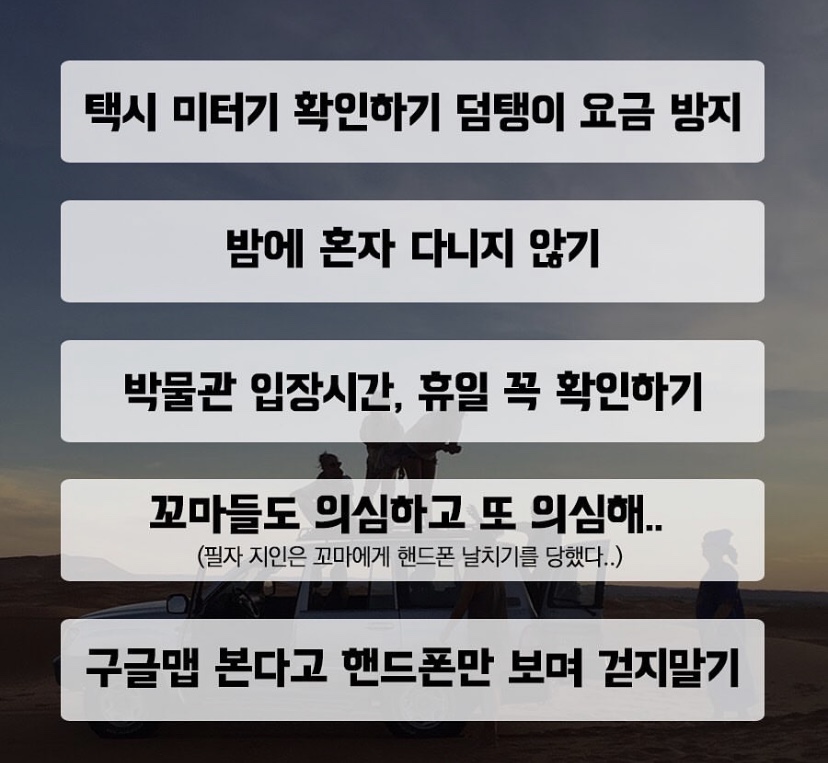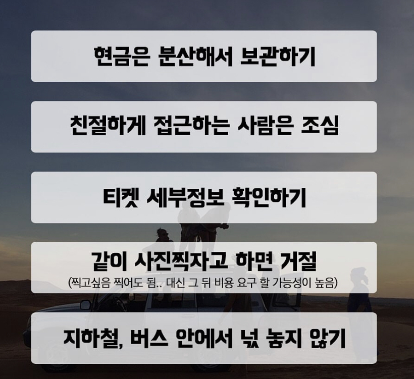 3) 길거리에서 모르는 사람이 말을 걸어올 때는 조심해야 합니다. 시간 등을 물어보면서 가벼운 터치와 함께 소매치기를 시도하는 경우가 많습니다. 또한 게스트하우스 등 공동 숙소에 묵을 경우 가방이나 짐을 두고 나올 때는 자물쇠를 채우는 것이 안전합니다.