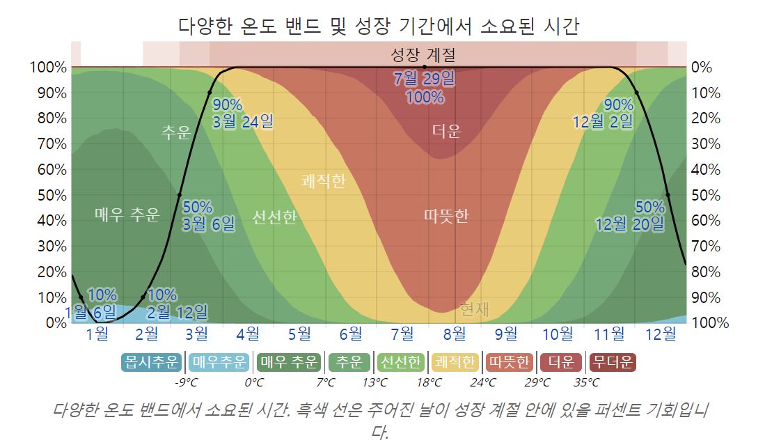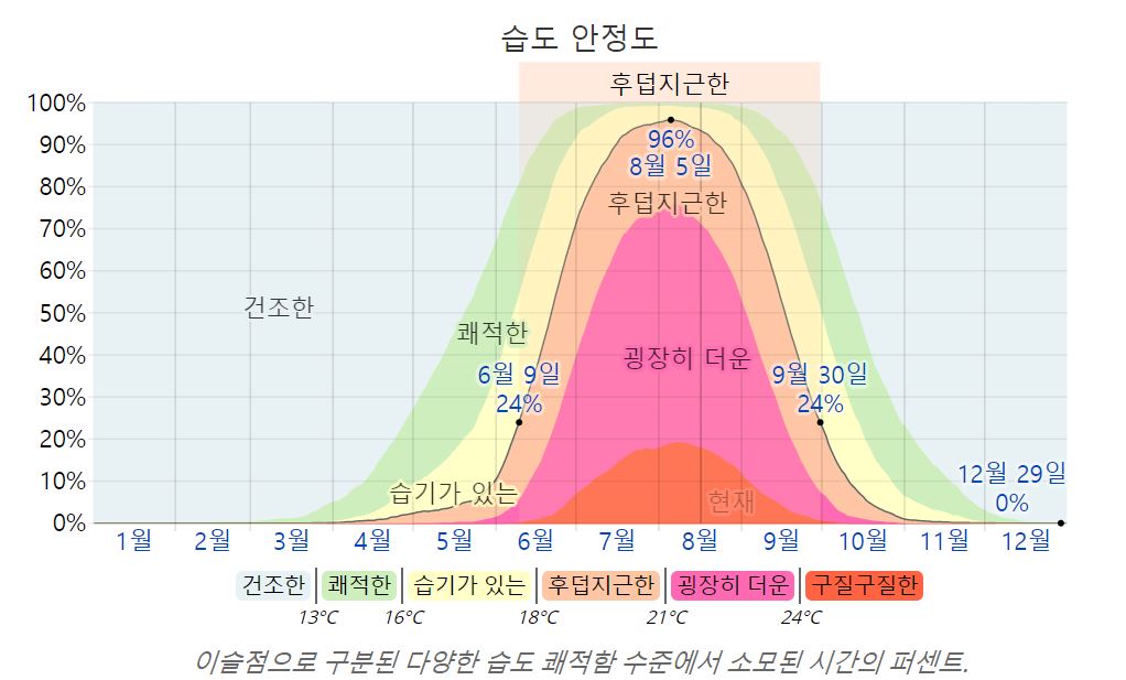년 중 가장 덜 후덥지근한 날은 12월 29일이며, 후덥지근한 경우가 전혀 없습니다. 완전 쾌적합니다.