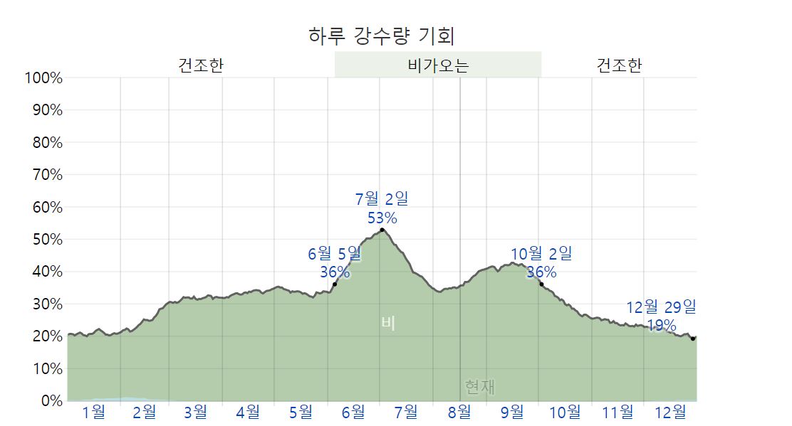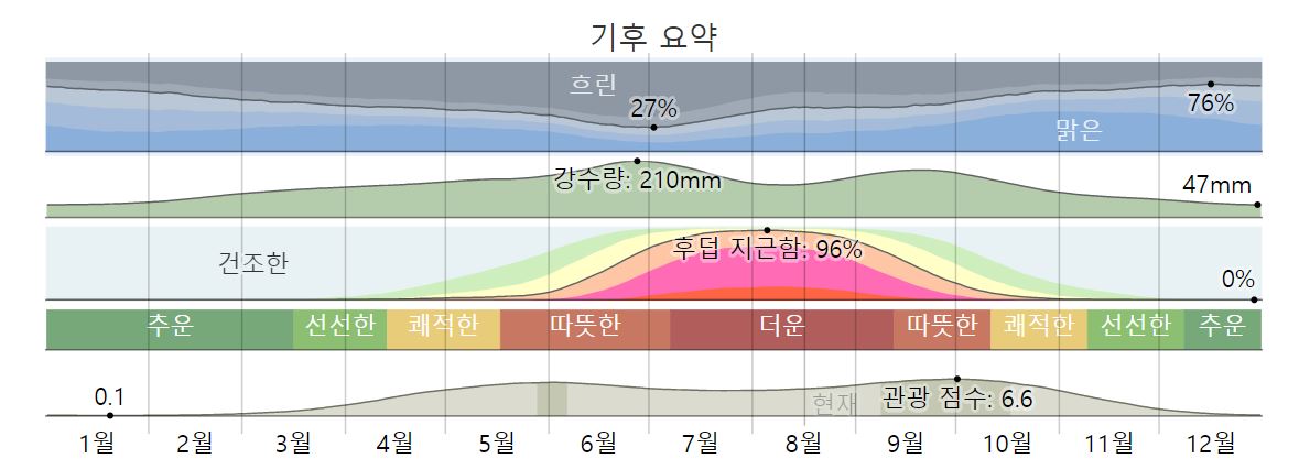비가 더 많이 오는 계절은 3.9개월간 지속되며 6월 5일에서 10월 2일까지, 주어진 하루에 36%이상 오기도 합니다. 비가 가장 많이 오는 때는 7월 2일의 53%로 가장 높습니다.