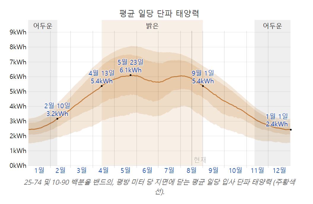 평균 일당 입사 단파 태양력은 일년을 통하여 상당한 계절적 변화가 있습니다.