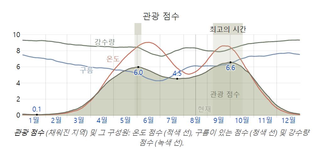 이번에는 오사카의 관광 점수를 알아보겠습니다. 외국인 관광객이 가장 많이 찾는 시기는 따뜻한 날씨를 유지하고 있는 5월입니다. 5월이 야외활동을 하기에도 가장 좋아 오사카 여행은 5월말에서 6월초까지 성수기라고 생각하시면 됩니다. 그 다음 성수기는 9월초에서 10월 중순 까지 입니다.